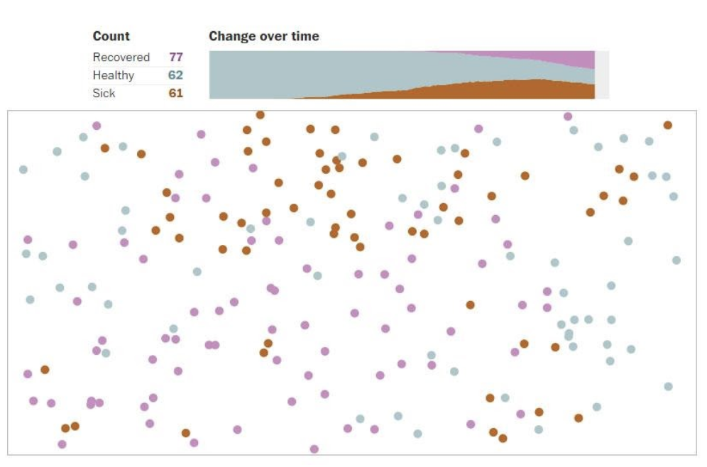 以防疫衛教為例,華盛頓郵報在一篇探討如何對抗疫情的報導當中,先以時間序列圖描述新冠肺炎感染人數呈「指數成長」,再以不同阻絕策略動態模擬病毒的擴散。比對四種模擬之後,驗證「廣泛保持社交距離(Extensive Distancing)」的情況下,感染人數曲線最為平緩,控制效果最佳(圖1)。此篇報導動態圖表的意涵深入淺出,在網路上被大量轉載和分享。