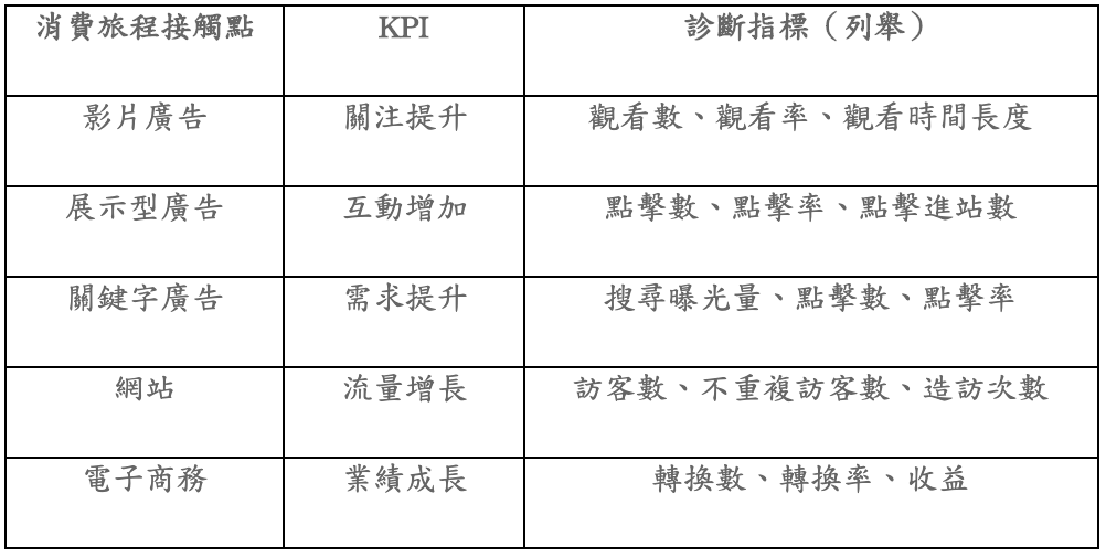 舉例來說,某個企業設定「三個月內官方網站的流量成長10%以促進銷售機會」,「促進銷售機會」是策略目標,「流量成長10%」是KPI,用來測量流量的「訪客數」則是診斷指標。表1列舉數位行銷常見的KPI與診斷指標: