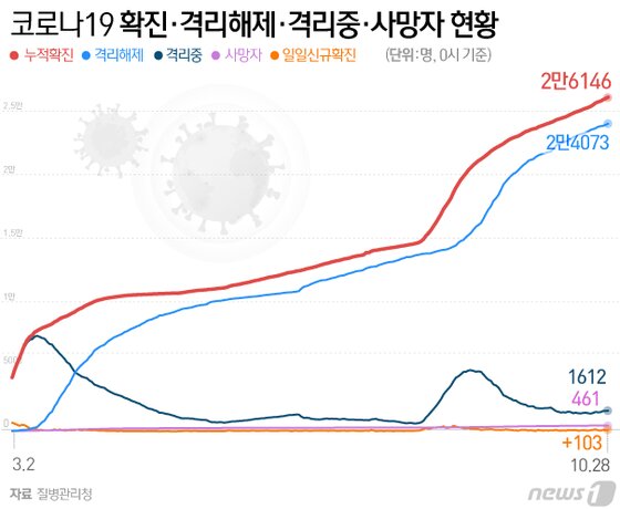 28일 방대본에 따르면, 이날 0시 기준 국내 코로나19 확진자는 103명 증가한 2만6146명으로 나타났다.