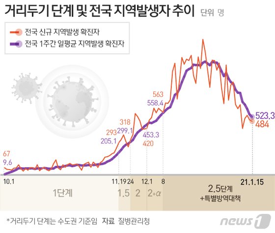 1주간 일평균 국내 발생 확진자는 523.3명으로 전날 544.1명에서 21.1명 감소했다. 지난 12월 26일 1016.9명을 정점으로 지속 감소세를 나타내고 있으며, 사흘째 500명대를 유지 중이다.